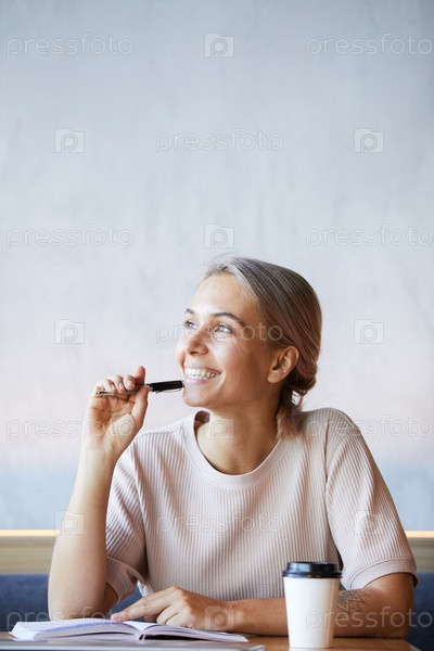 Мечтательный, взволнованный независимый журналист с пепельными волосами сидит за столом и думает о новых идеях для статьи