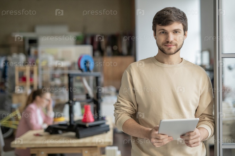 Молодой привлекательный бизнесмен с планшетом, просматривающий сеть в поисках креативных сайтов