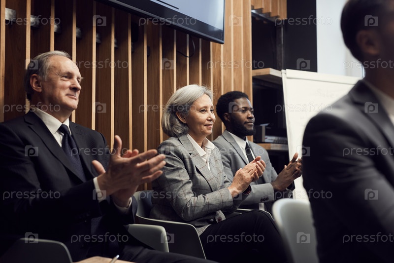 Группа улыбающихся мультиэтнических бизнесменов разного возраста, сидящих в очереди и хлопающих в ладоши во время приветствия спикера на конференции