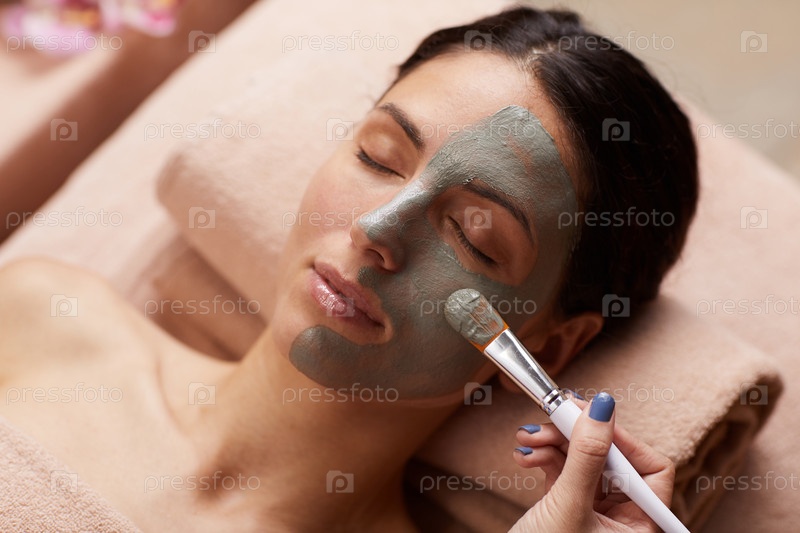 Близкий план косметолога, наносящего глиняную маску с щеткой женщине для очистки пор кожи, молодая женщина наслаждается спа-процедурой