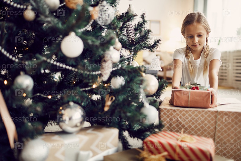 Маленькая девочка с рождественскими подарками дома