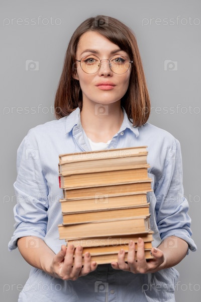 Молодой серьезный учитель литературы держит кучу книг