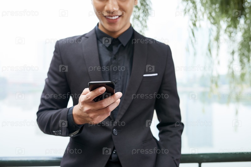 Улыбающийся предприниматель пишет смс