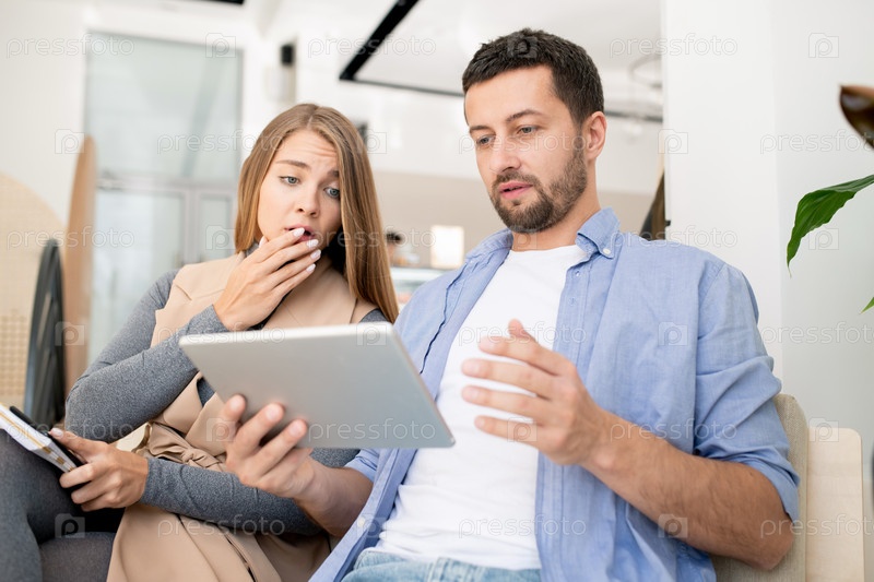 Молодая обеспокоенная пара смотрит на дисплей с сенсорной панелью во время серфинга в сети