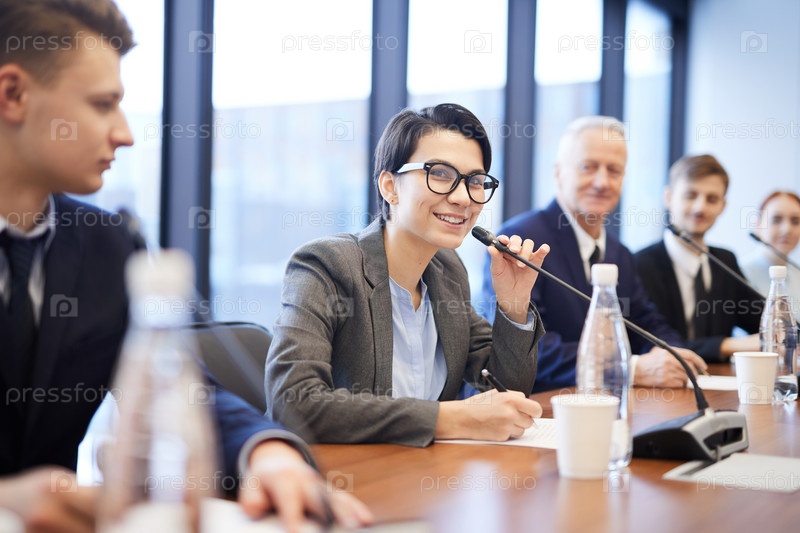 Улыбающаяся молодая предпринимательница выступает на конференции