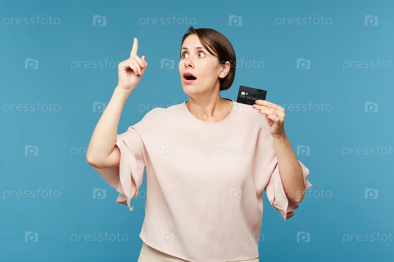 Удивленная женщина с черной кредитной картой на синем фоне