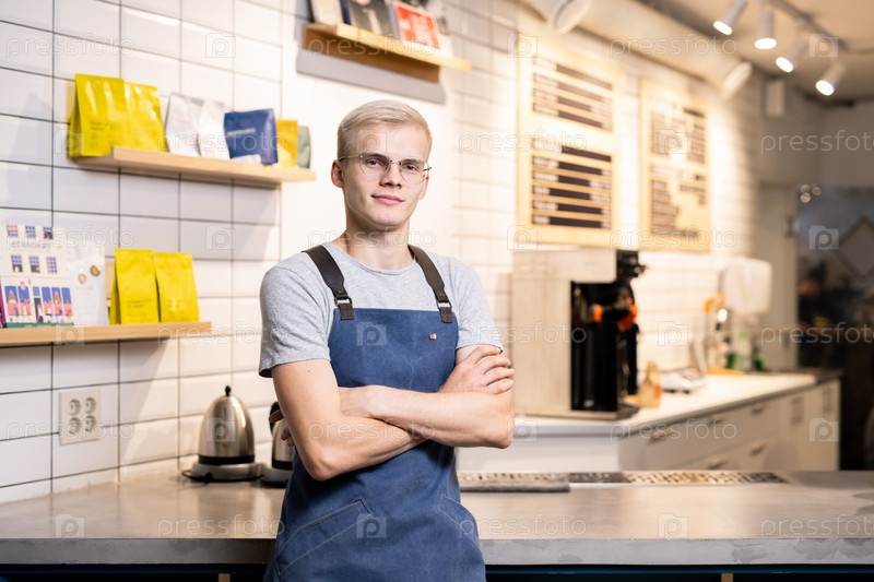 Молодой бариста или владелец кафетерия, стоящий за столом