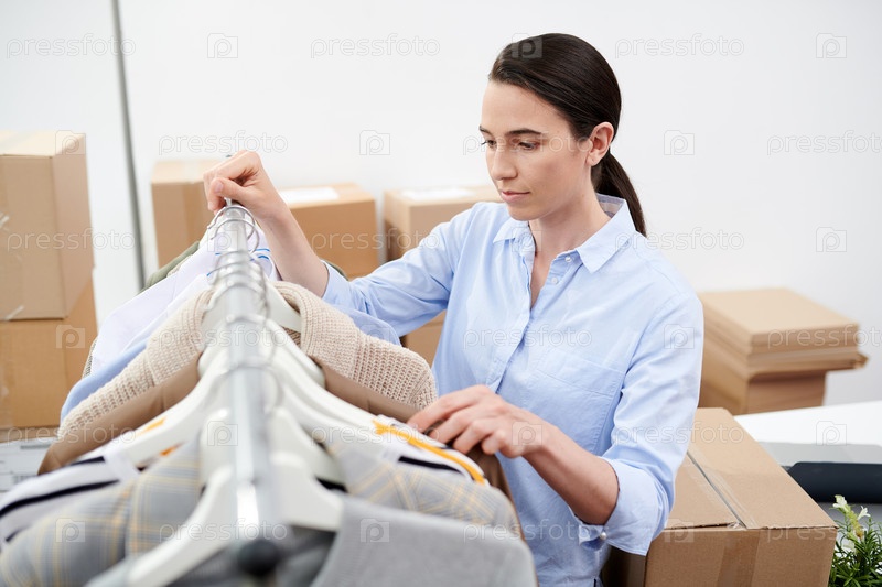 Молодая серьезная женщина в повседневной одежде ищет одежду подходящего размера