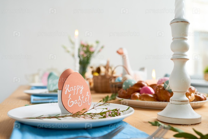Тарелка с пасхальными украшениями: Пасхальный обеденный стол с традиционным блюдом на кухне