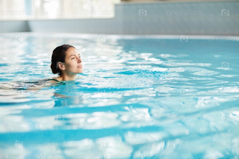 Улыбающаяся красивая молодая женщина плавает в чистой воде бассейна, ожидая времени в фитнес-клубе