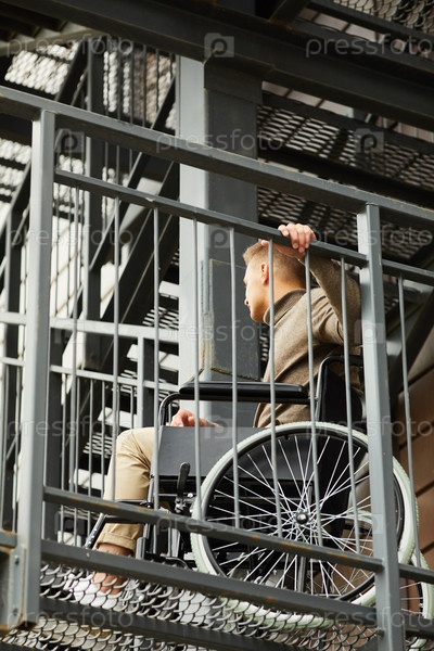 Молодой инвалид в коричневом гардеробе сидит на инвалидной коляске и держит металлические перила, пытаясь подняться по лестнице