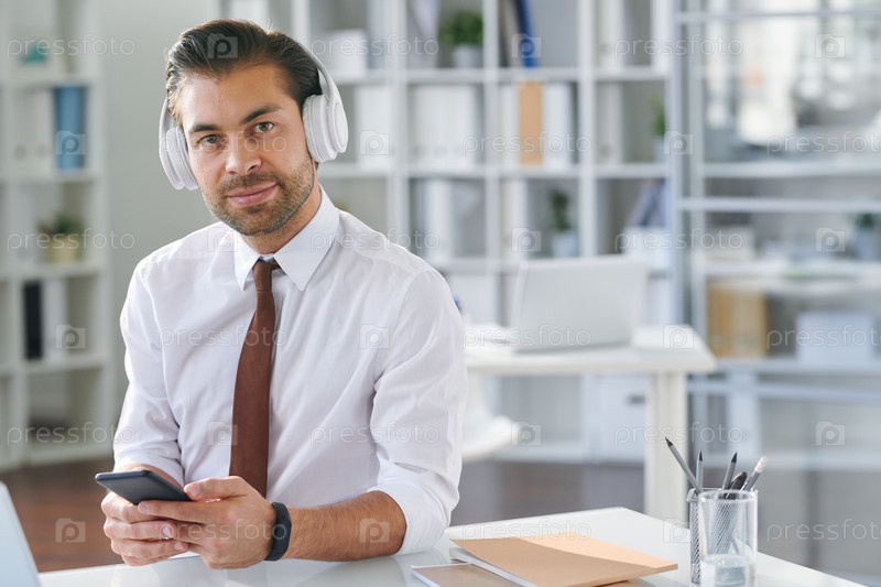 Молодой хорошо одетый бизнесмен со смартфоном слушает музыку