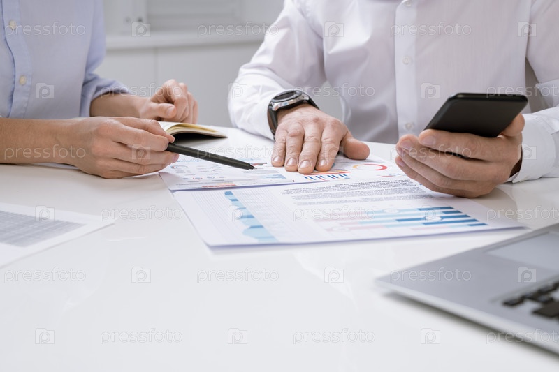 Руки современных экономистов, обсуждающих финансовый график на бумаге