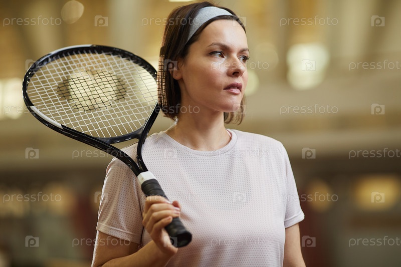 Интроспективная теннисистка среднего возраста с коричневыми волосами, которая стоит на корте и держит ракетку, размышляя о дальнейшем матче