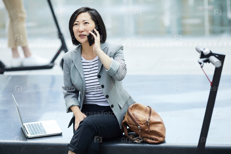 Женщина говорит со смартфона в азиатском городе