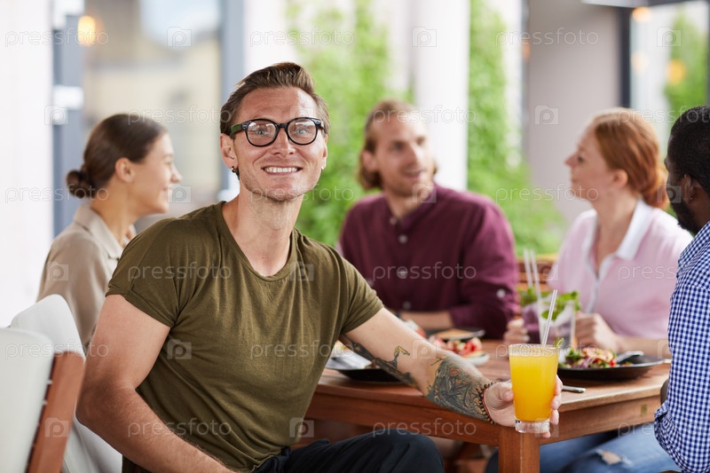 Татуированный мужчина наслаждается обедом с друзьями в кафе