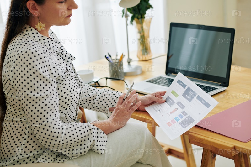 Деловая женщина анализирует прототип мобильного приложения
