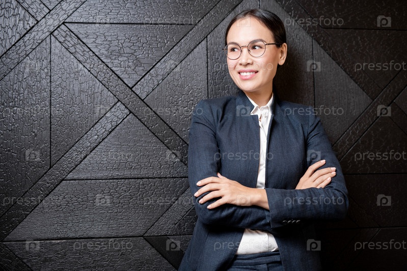 Молодая улыбающаяся азиатская бизнесвуменка стоит у черной деревянной стены