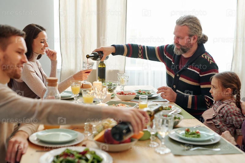 Взрослый бородатый мужчина наливает вино в стакан своей маленькой дочери во время ужина