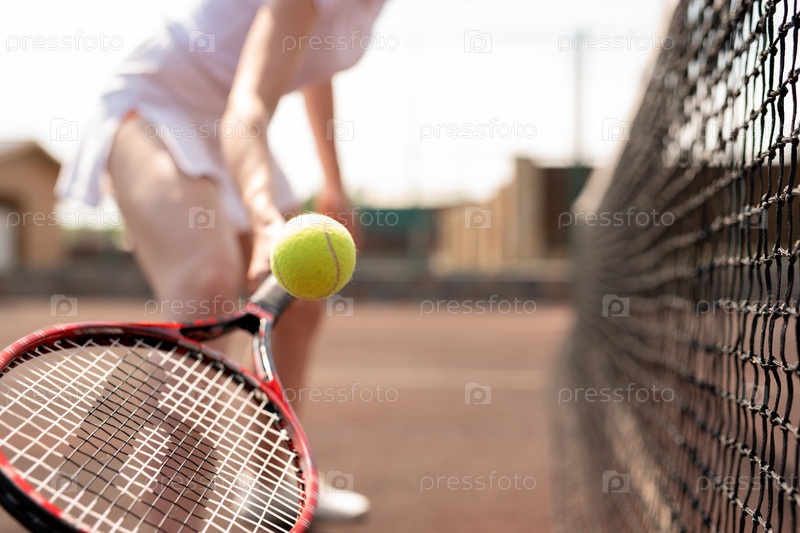 Теннисный мяч над ракетой, удерживаемый молодой игрой-женщиной