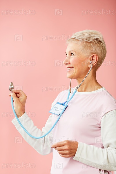 Позитивный красивый зрелый блондинский врач в розово-белой форме стоит на нежном розовом фоне и использует стетоскоп