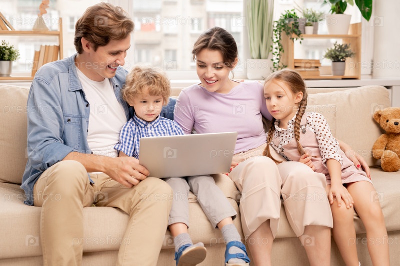 Счастливый молодой женатый мужчина и женщина и милые дети смотрят на дисплей ноутбука