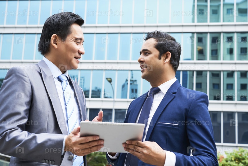 Два бизнесмена разговаривают на открытом воздухе