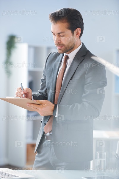 Молодой уверенный финансист делает заметки или подписывает контракт