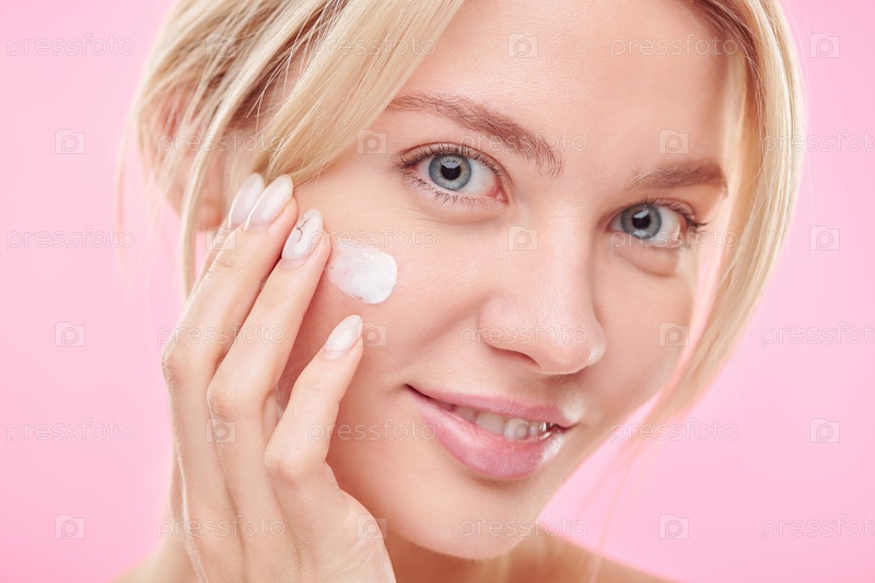 Привлекательная женщина наносит увлажняющий крем на щеку во время процедуры по уходу за кожей