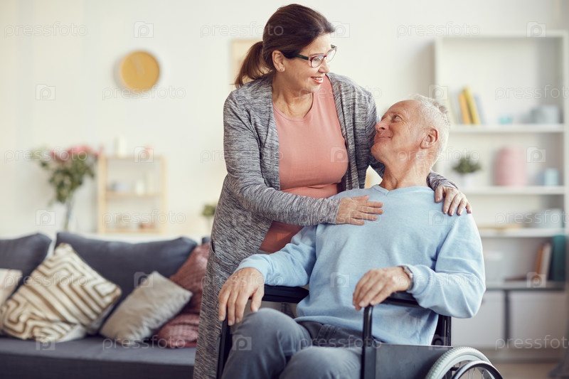 Счастливая привлекательная пожилая женщина с хвостом коня, касающаяся плеч своего мужа в инвалидном кресле во время разговора с ним в гостиной