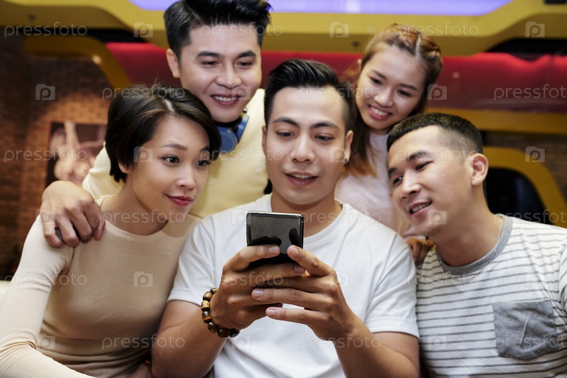 Молодые люди смотрят на смартфон друга
