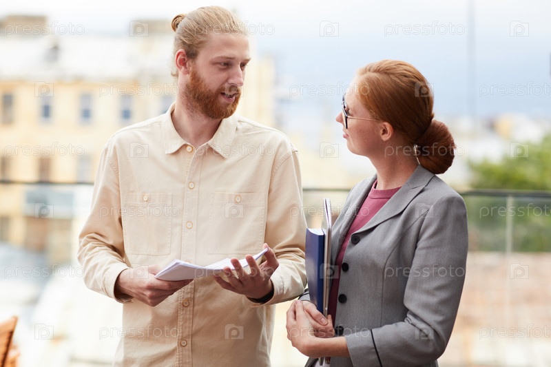 Два деловых партнера обсуждают то, что происходит на свежем воздухе