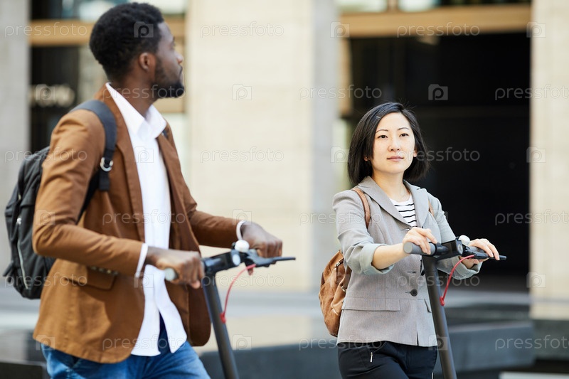 Пара едет на электрических скутерах в городе