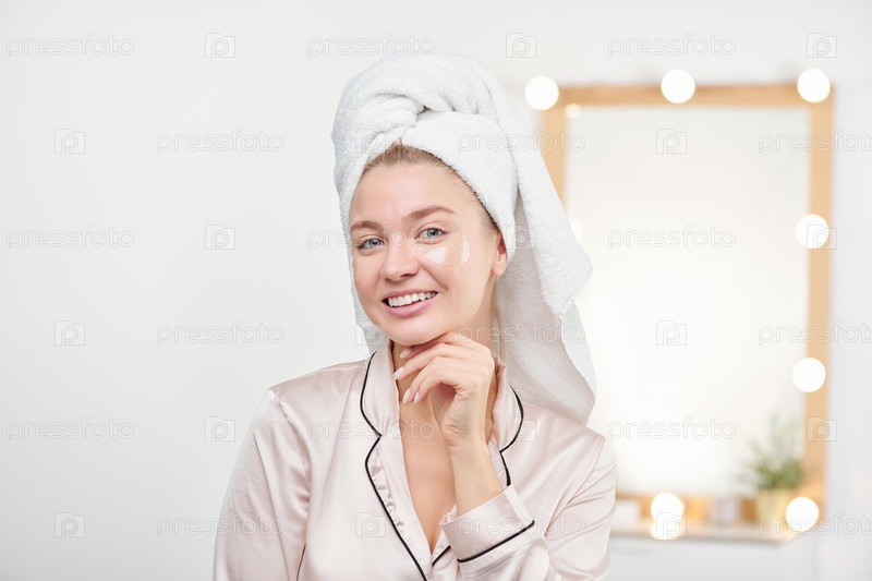 Молодая улыбающаяся здоровая женщина с освежающими подглазными пластырями смотрит на тебя
