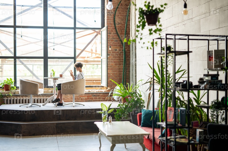Молодая женщина со смартфоном сидит в кресле рядом с столом внутри большой студии
