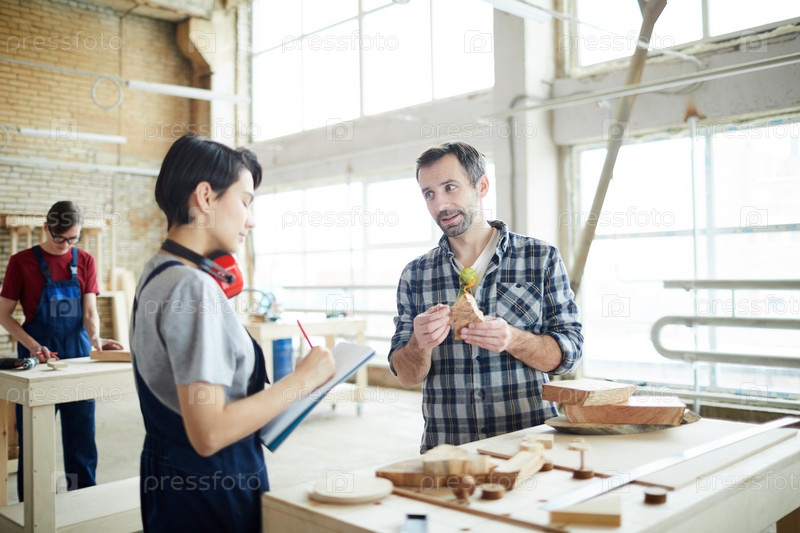 Плотник объясняет стажеру, как работать с деревом