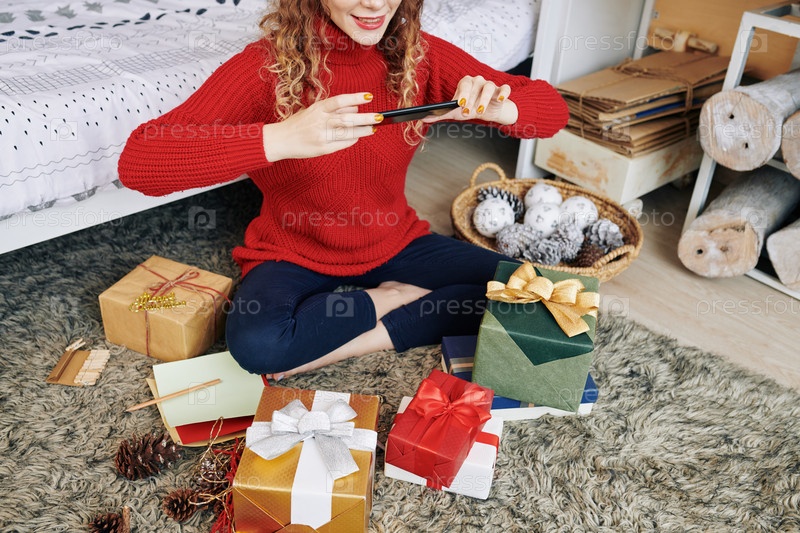 Позитивная женщина фотографирует подарки