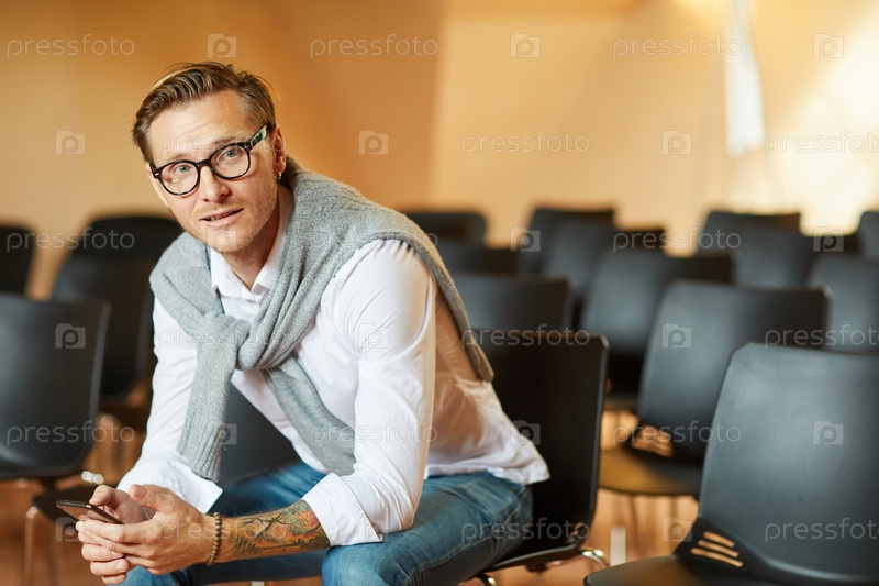 Портрет хмурого современного бизнесмена с крутой прической, сидящего на кресле в конференц-зале и использующего смартфон