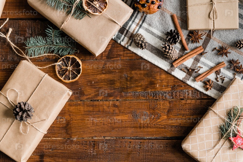 Коробки с рождественскими подарками, сосны, украшения и специи на деревянном столе