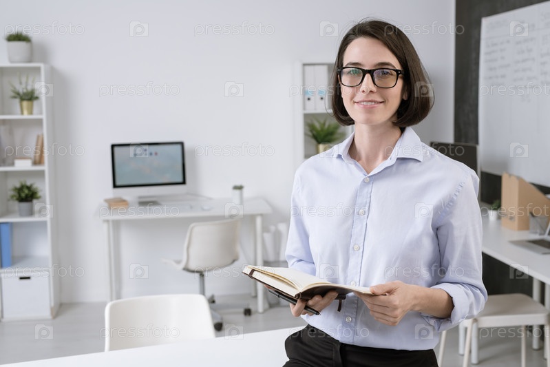 Довольно молодой улыбающийся сотрудник с открытой тетрадью стоит перед камерой
