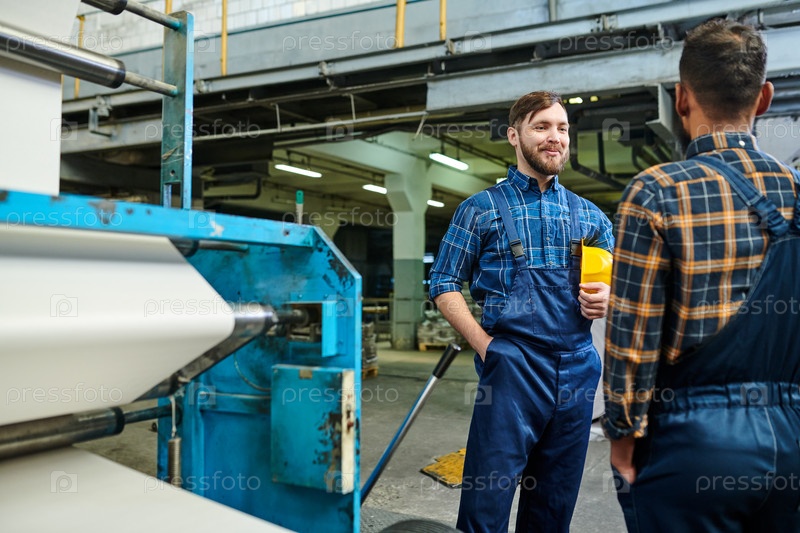 Содержание молодых промышленных рабочих в форме, стоящих у печатной машины и болтающих на фабрике