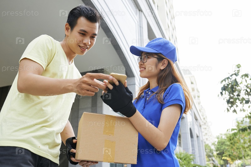 Курьер показывает смартфон клиенту