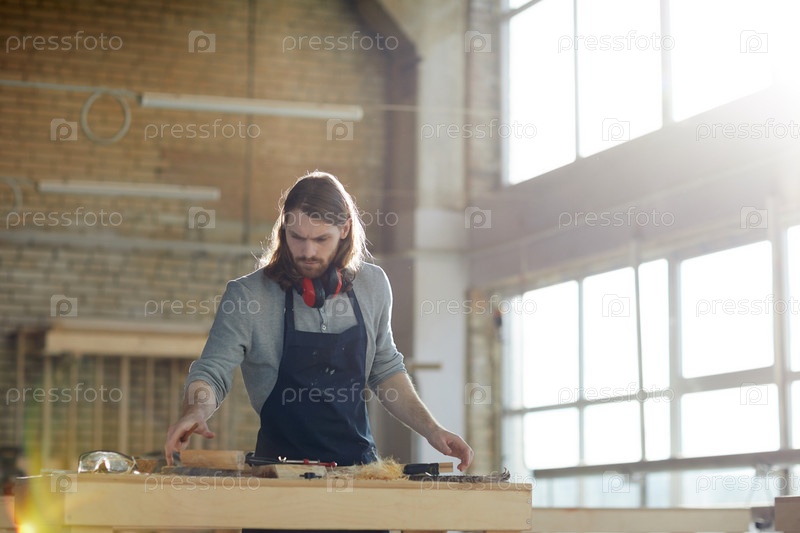 Серьезный занятый плотник в фартуке, носящий защитные устройства для ушей на шее, стоящий в просторной мастерской и производящие деревянные детали для мебели