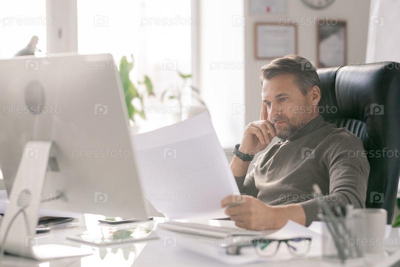 Зрелый серьезный архитектор смотрит на эскизы, проверяя их по рабочим местам