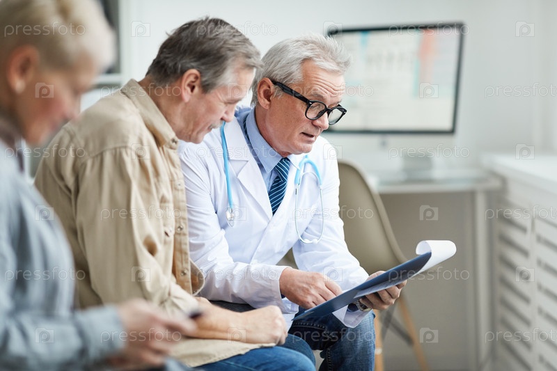 Старший врач-мужчина в очках держит доску с документами и комментирует результаты тестов, разговаривая со зрелым пациентом