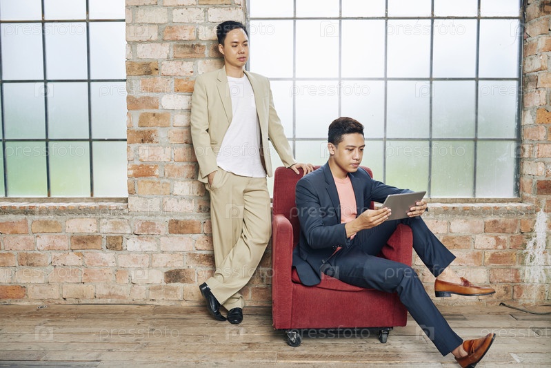 Бизнесмены читают документ на планшете