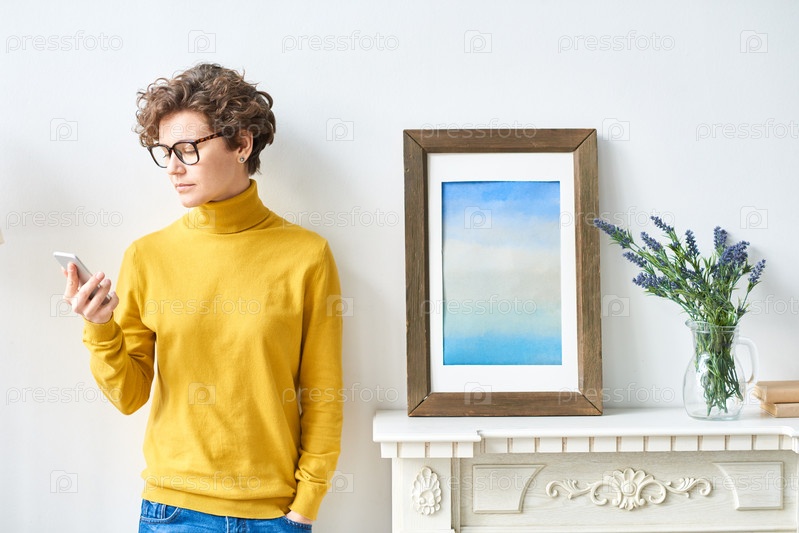 Серьезная леди-хипстер читает смс
