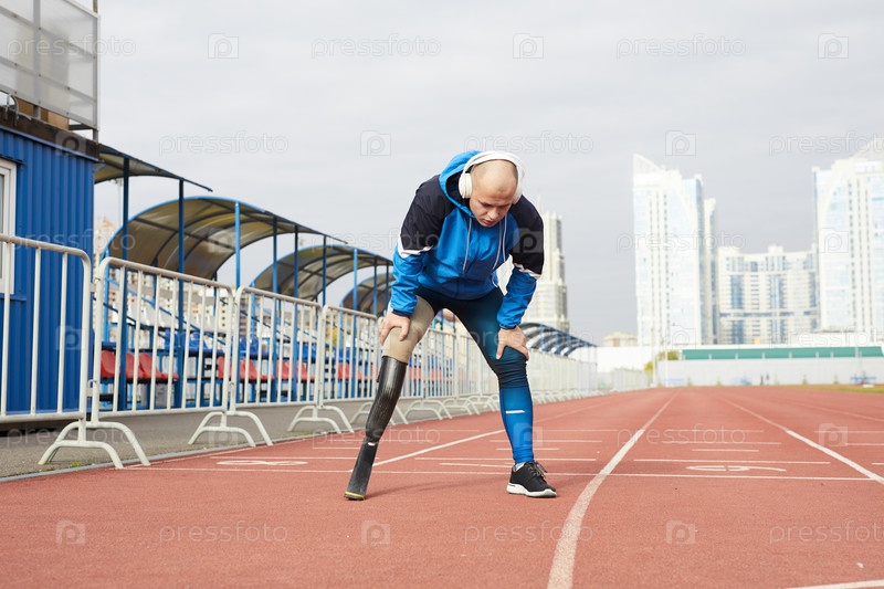 Исчерпанный лысый молодой инвалид с пробежным лезвием устал после бега, опираясь на колени и глубоко дышащий