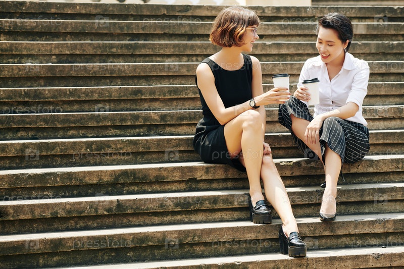 Сплетничающие деловые женщины, сидящие на ступеньках