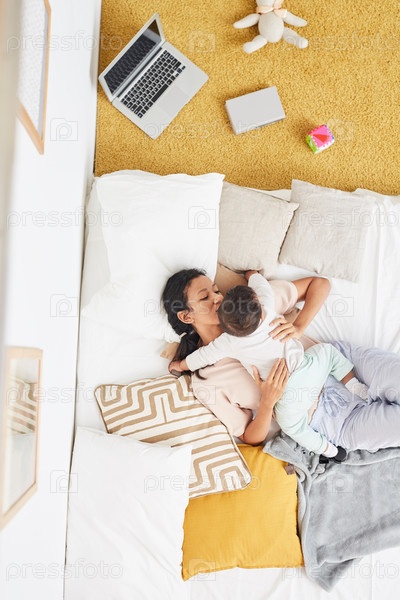Мать играет с ребенком в постели